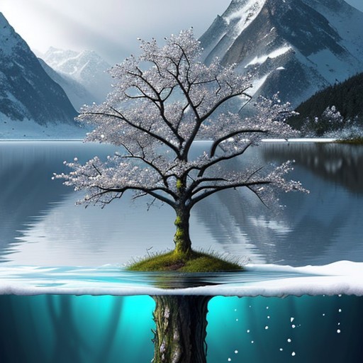 great magical tree growing from submerged out of lake on a snowy mountain, the tree is huge and the lower part is completely submerged, the tree gives off a powerful and mesmerizing magic