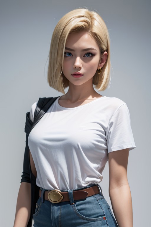 best quality,masterpiece,8k Amazing,finely detail,masterpiece,highres,extremely detailed,white background, simple background, 1girl,solo,android 18,Upper body, white shirt, android18, earrings, denim, belt, easynegative