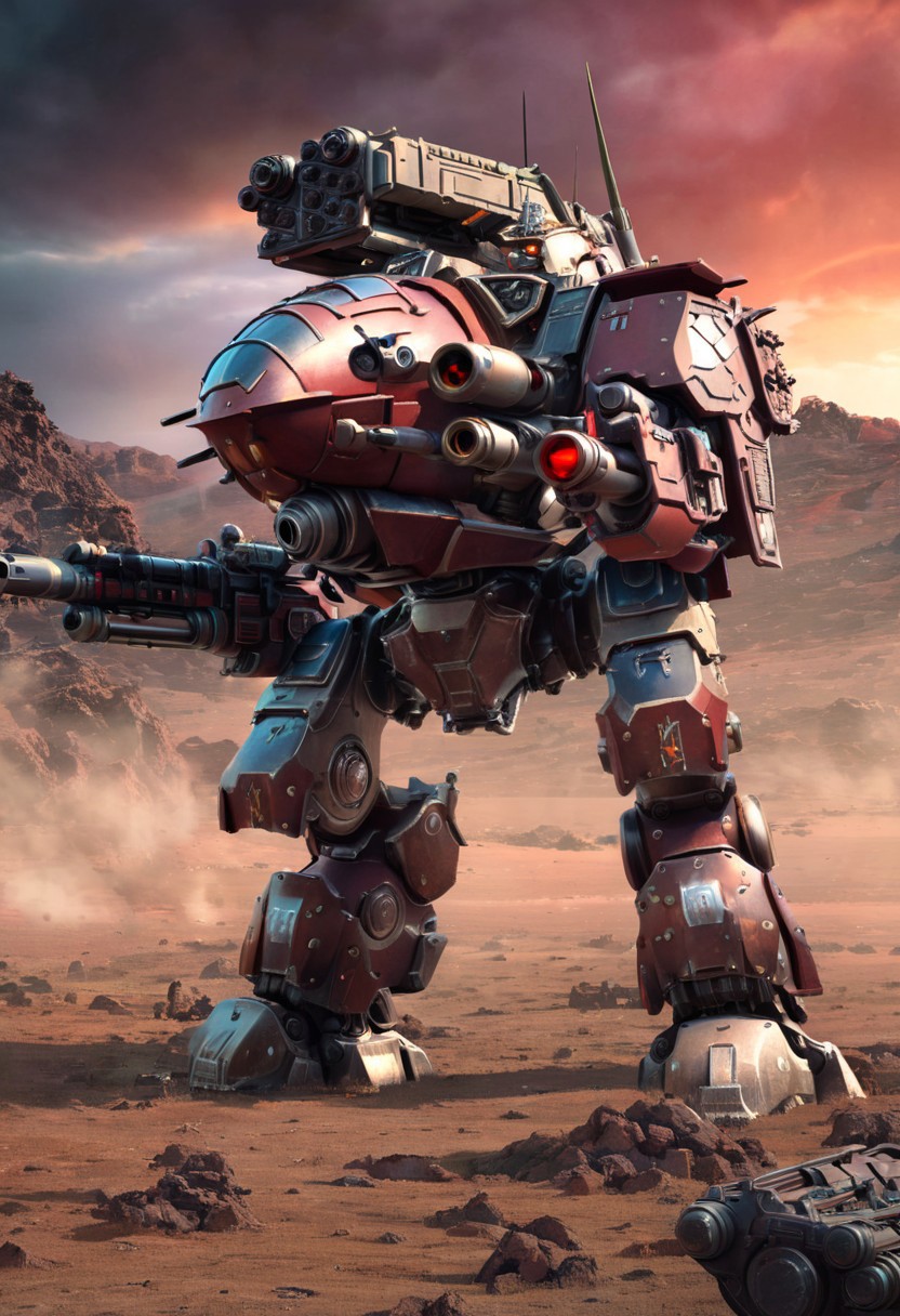 ((Best Quality)), ((Master Works)), (Very detailed: 1.3), 8K, cool painting, full of sci-fi, gunsmith, red tank armor division holding a huge shield, heavy armor up to MK2, red mech, mask covering face, holding a shield in the air, super large mechanical shield, heavy weapons, heavy machine guns, sniper rifles, cannons, Gatling machine guns scattered on the ground, carrying weapons and firearms, pistols on the waist, sniper rifles behind the back, super cool tank armor, weapon gods, Gundam Humanoid Mech, Anime Mech Aesthetics, Perfect Body Proportions, Heads-Up View, Standing Pose, Military Giant Mech, Missiles, Rocks, Future Technology, Realism, Clouds in the Sky, Dark War Background, Edge Light, Ray Tracing, Light Particle, NVIDIA Trtx, Super Resolution, Unreal 5, Subsurface Scattering, Specular and Albedo Map, Rule of Thirds, Large Aperture, Battle Stance, 8K Raw Data, High Efficiency Sub-pixels, Subpixel Convolution, Light Particles, Light Scattering, Tyndall Effect, Ray Tracing.