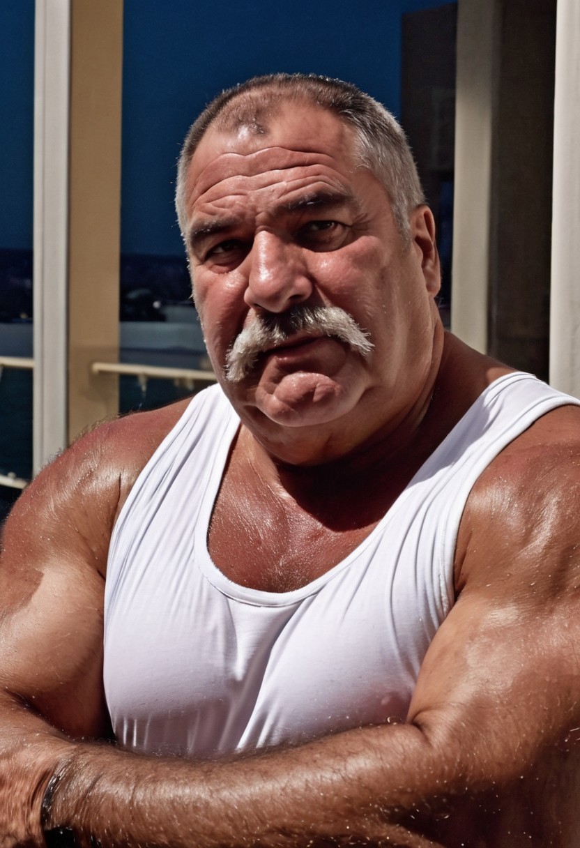 ((romantic flirty expression, intimate, cinematic hazey atmosphere, arthouse movie, dark, nighttime, night, dark shadows, photograph, romantic movie scene)), old mature chubby obese greek strongman man, old turkish musclechub daddy, tanned skin, sweaty skin, sweating, oily skin, extremely hairy, hairy chest, hairy arms, hairy shoulders, doublechin, fat arms, big arms, gigantic biceps, hairy armpits, handsome chubby old face, loving expression, flirty smirk, white latex undershirt muslceshirt tanktop, golden jewellery, chunky golden rings, gold earring, in a dark swimmingpool at night, nighttime, dim, janitor, hobo, construction worker, trucker, brute, wise, barbarian, berserker, leader, boss, ((flexing his massive biceps, tanned old bodybuilder)), ((masculine manly chubby face, extremely intimate sensual expression, loving expression)), (((relaxed pose, sitting near the pool)))
