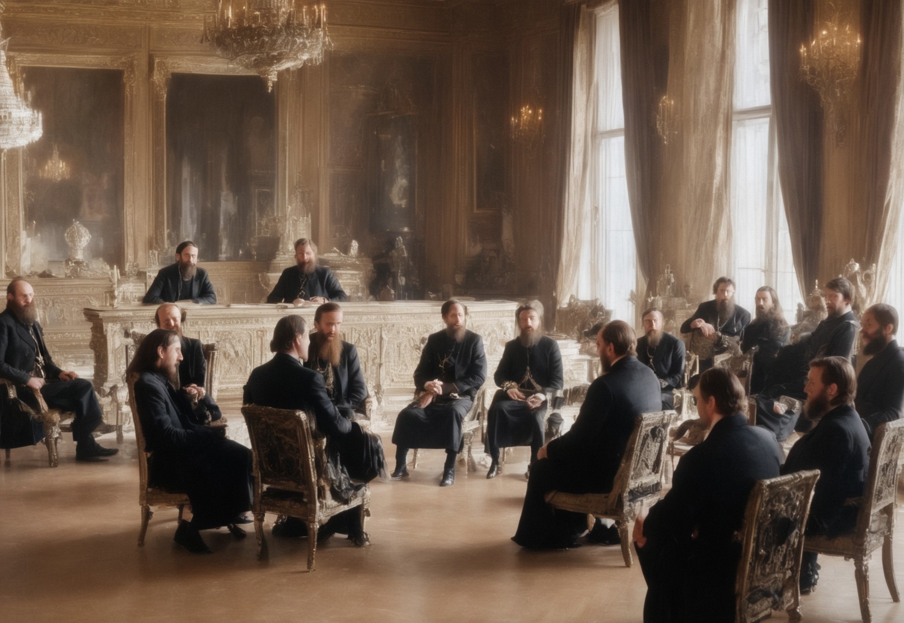 Cinematic photograph, Rasputin smiling enigmatically at a dozen advisors to the Russian aristocracy. Frustrated advisors sitting opposite, Mid 19th century Russian palace room, highly ornate, detailed, day light streaming in through windows, volumetric lighting, perfect eyes, perfect hands, 8k, professional photograph, award winning photograph, brilliant lighting, side view,detailed