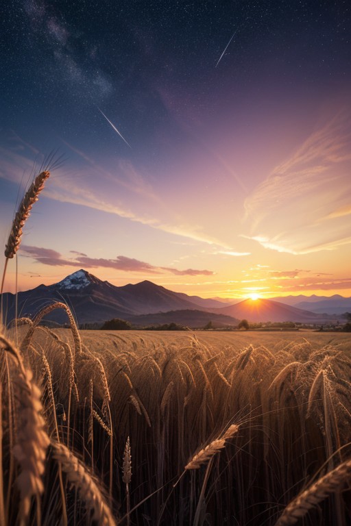(Scenery at sunset:1.5), ((field of wheats with a mountain range in the background)), fall, Faint starry sky, (Photorealistic, Photorealistic:1.37), Highest quality, 4K, 8K, High resolution, masterpiece:1.2, Super detailed, HDR, uhd, Studio Lighting, Ultra-fine painting, Sharp Focus, Physically Based Rendering, Extremely detailed depiction, professional, Bright colors, Bokeh, wtrcolor style