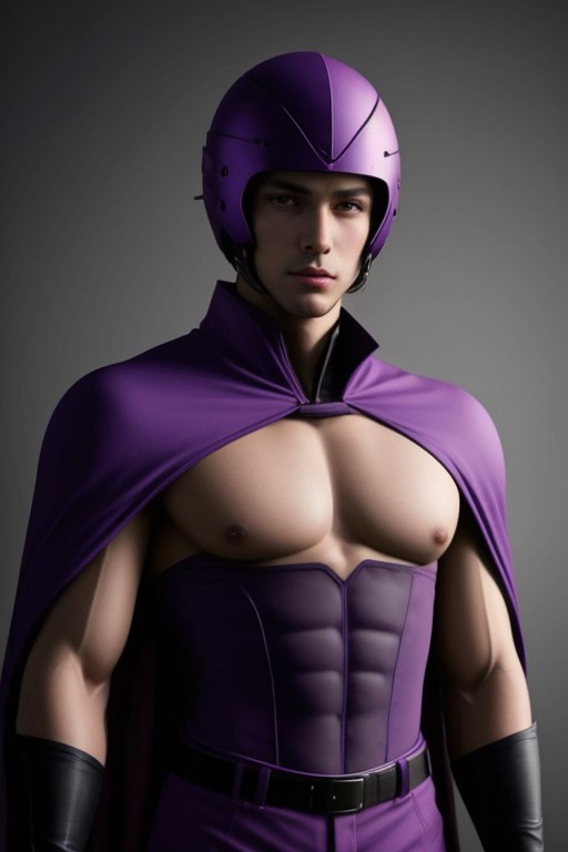 A male, very muscular, with dark purple lips. Wearing a dark purple full-face helmet (the helmet covers the entire head and eyes, and the helmet is shaped like a bird's upper peck), a full set of dark purple high-collar tight-fitting combat uniforms (the surface of the combat uniform has muscle texture), and a dark purple cape. FHD, masterpiece, realistic style.