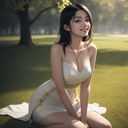 masterpiece, best quality, realistic, extremely detailed, colorful, cinematic lighting, extremely detailed, ultra realistic, beautiful detailed face, full body PORTRAIT, textured skin, remarkably detailed pupils, realistic dull skin noise, visible skin detail, skin fuzz, dry skin, photograph of an extremely delicate and beautiful 20yo emo girl, golden ratio, blush, natural detailed skin texture, solo, diamond cross necklace, smile look at puppy running, extremely detailed face, beautiful symmetric eyes, seductive eyes, big eyes, slim face, smirk, perfect white teeth, eye catching, Chinese dress, 2 round ribbons on the head, slim waist, dark areolas, long legs, sitting on grass in a park in spring, dynamic pose, outdoors, side view, far away