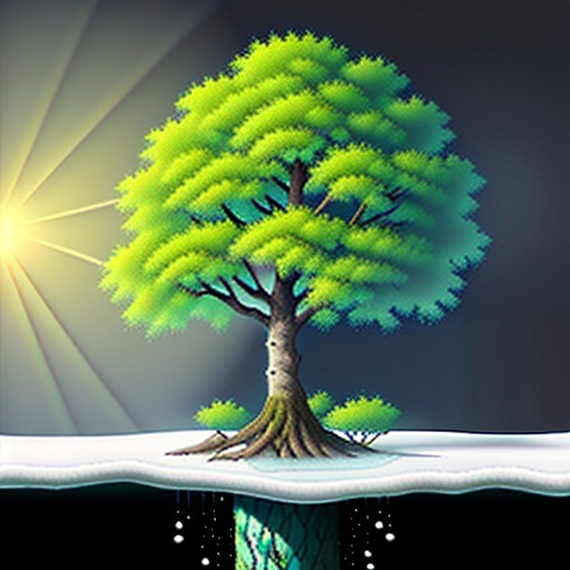 great magical tree growing from submerged out of lake on a snowy mountain, the tree is ginormous, huge and magical, and the lower part is completely submerged, the tree gives off a powerful and mesmerizing magic