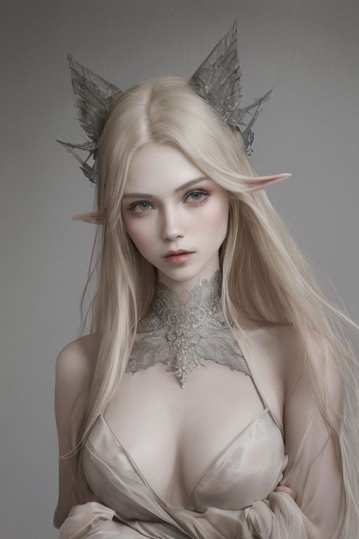 slender and tall elf, standing at 5'7". blonde hair is long in the back and short in front.long ears, which are 2.5 inches long. huge breasts. skin is a pale, ethereal shade, with high cheekbones and a delicate jawline. eyes are a bright, piercing green, framed by long, curved lashes. lips are soft and full, a delicate rose color . nose is small and straight, with a slight upturn at the end. ears are pointed and elongated, standing out from head.