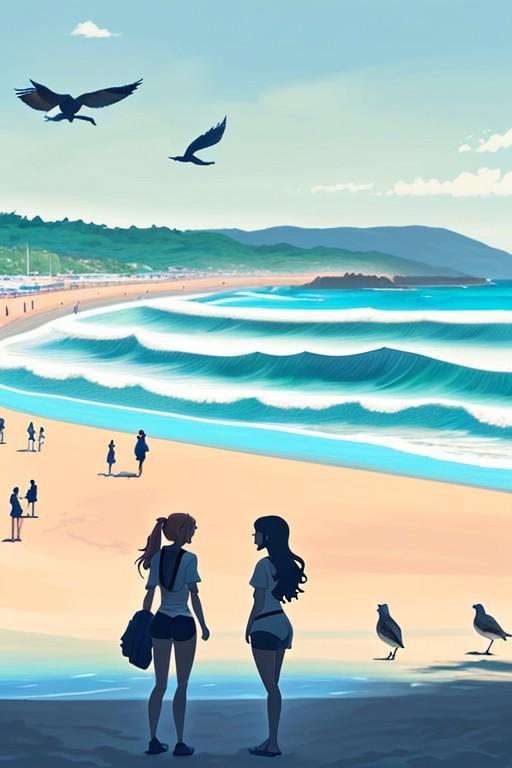 Two european girls are playing together in the beach in the foreground. in the backgroung we see a beautiful landscape with birds and waves. Everything is in Anime brush