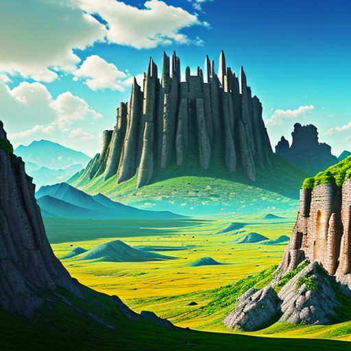 masterpiece, 8k, gorgeous mountains full of vegetation, different type of trees, rock mountains, extremely high detailed, beautiful sky, alien temple ruins