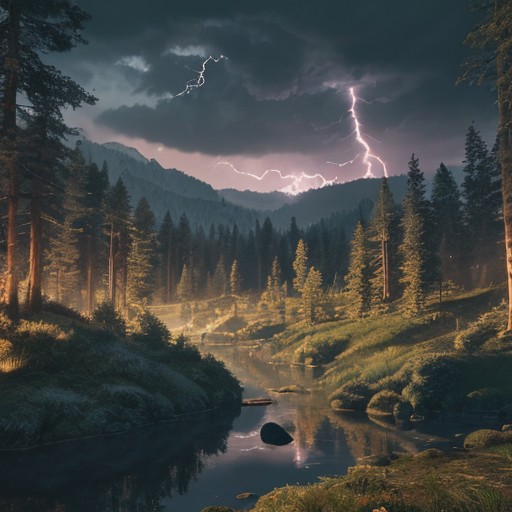 masterpiece, enchanted forest, mountains, 8k, volumetric lightning, crisp digital render, reflective textures, intricate details, extremely high resolution