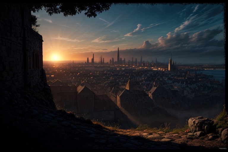 With light tones and backlit resolution, this oil painting depicts a medieval cityscape.