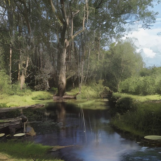 HDR photo of Observe a vast, billowing cloud, over a pond surrounded by dense short vegetation. water surface reflects the clouds like a mirror. reflection on pond does not match the billowing cloud instead showing storm clouds
