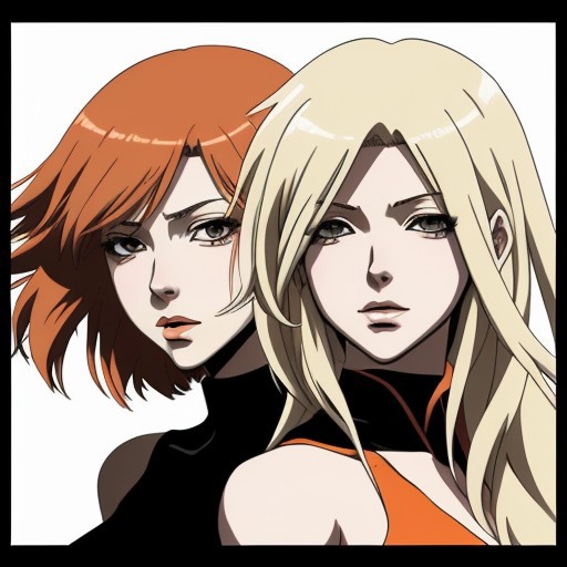 Anime style. Long blonde and redhead girl. Duotone hair color. White background. Strong heavy shadows. Strong outline Black, red, Orange. Strong thick heavy fat black dark stroke lines. pronounced strokes. Dynamic.