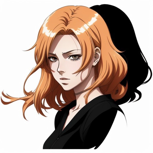 Anime style. Long blonde and redhead girl. Duotone hair color. White background. Strong heavy shadows. Strong outline Black, red, Orange. Strong thick heavy fat black dark stroke lines. pronounced strokes. Dynamic.