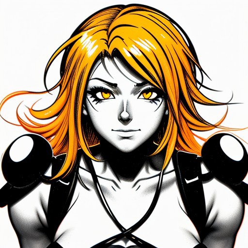 Anime style Blonde. Black and white and orange. Orange eyes. White background. Duotone hair. Thick strong fat black lines. Neon highlights.
