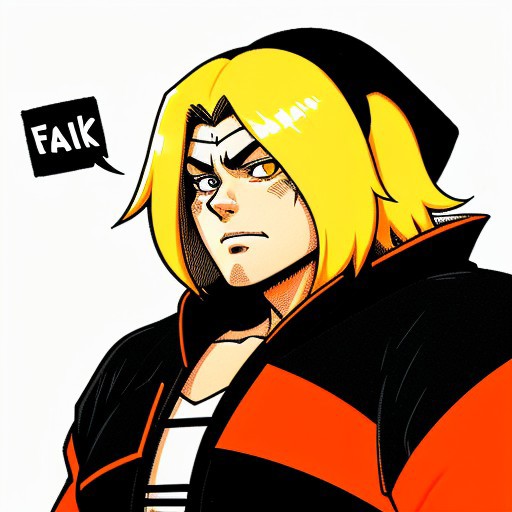 Anime style Blonde. Black and white and orange. Orange eyes. White background. Duotone hair. Thick strong fat black lines. Neon highlights.
