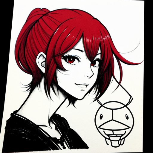 Anime redhead girl. Black and white. Anime style. White background with shapes. Thick lines. Heavy strokes. Black strong lines. Red highlights. Unfinished.