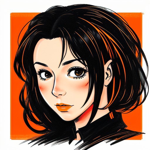 Anime Girl. Duotone: Orange and Black. Orange highlights. Colored orange lines. Strong thick fat black dark lines. Amateur Lines. FAST RUSHED. UNFINISHED. Red highlights. Highlights.
