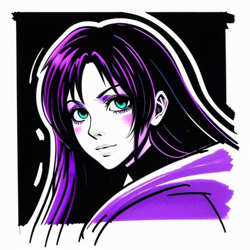 Anime Girl. Duotone: Orange and Black. purple highlights. Colored purple lines. Strong thick fat black dark lines. Amateur Lines. FAST RUSHED. UNFINISHED. Red highlights. Highlights.