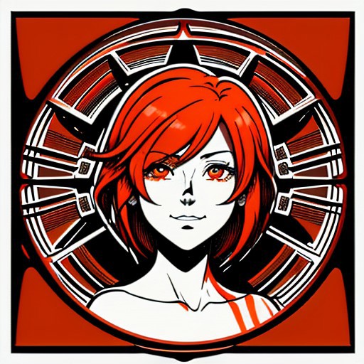 Anime style. Redhead girl. Metal art. Esoteric art. Strong stroke. Red and Orange stroke lines. Red and white outline.