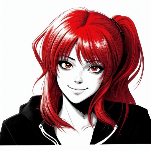Anime style Redhead Girl smirking. white background. Black and white red only. Strong dark thick lines. Heavy strokes. Heavy strong outline, white.