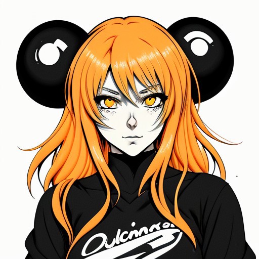 Anime style Blonde. Black and white and orange. Orange eyes. White background. Duotone hair. Thick strong fat black lines. Neon highlights.