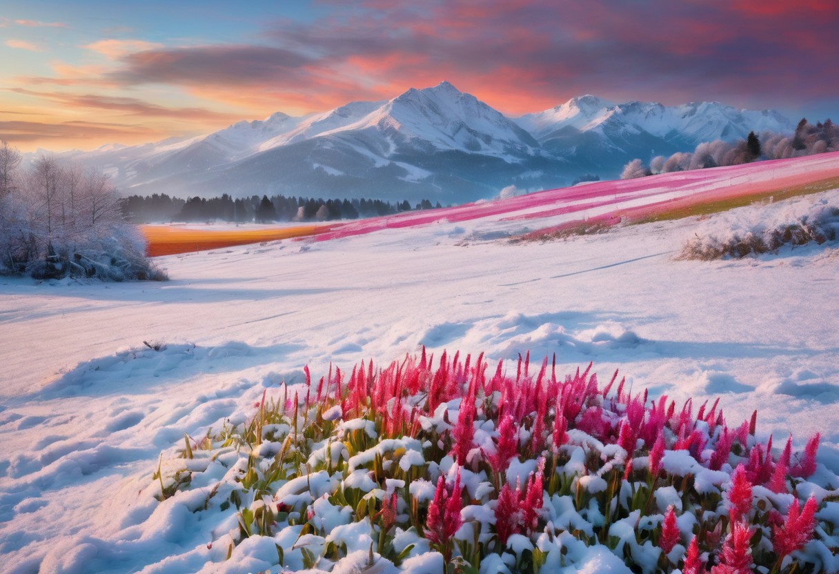 absurdres,masterpiece,vibrant,colorful,scenery,nature,in winter,day,snow covered flower field,sky,cirrus,landscape,