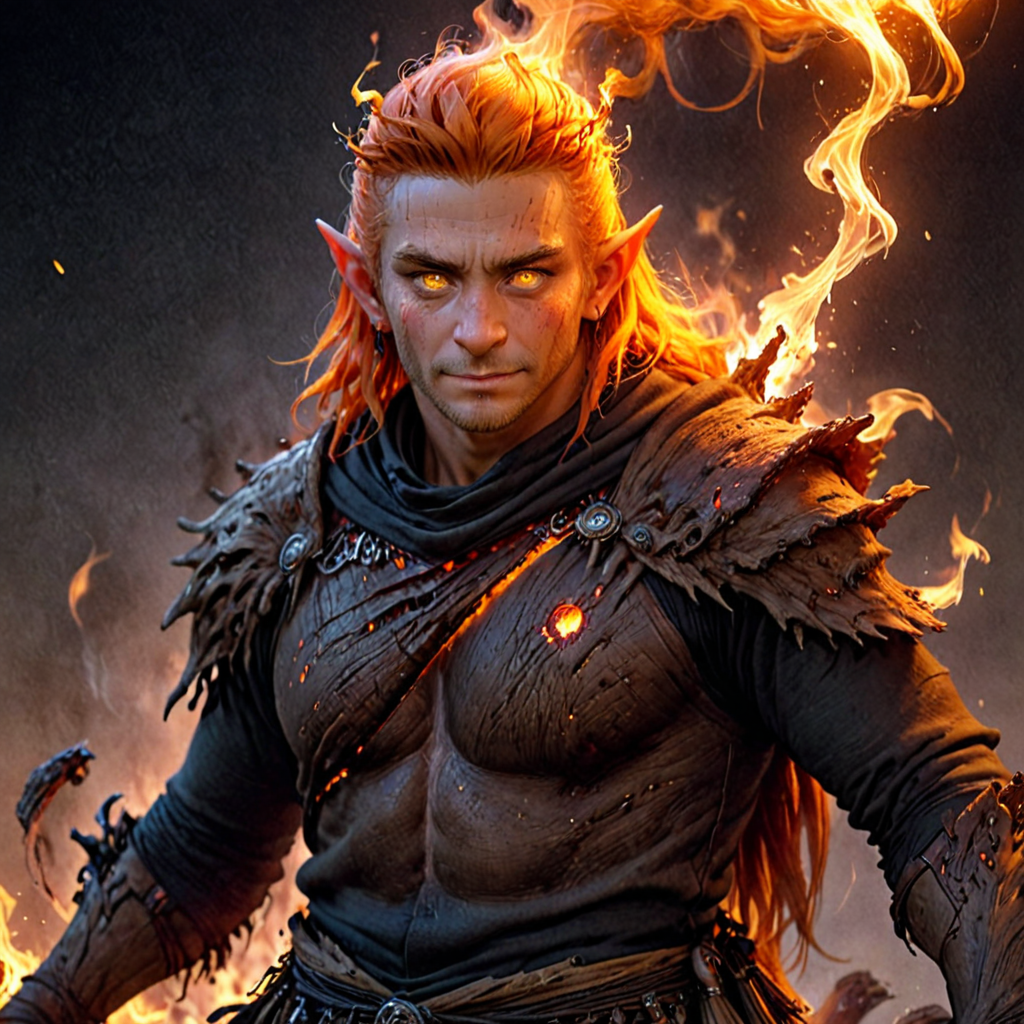 1boy(FireGenasi, fire genasi, young man, sorcerer, tall, handsome, yellow eyes, fiery hair, colored sclerae, white skin, human ears, solo, cowboy shot, angry, looking at the viewer, solo, slender, pumped up), detailed background, depth of field, full height, subsurface scatter, against an active volcano, (art by Charles Douglas Richardson in style of Brian Froud:1.2)