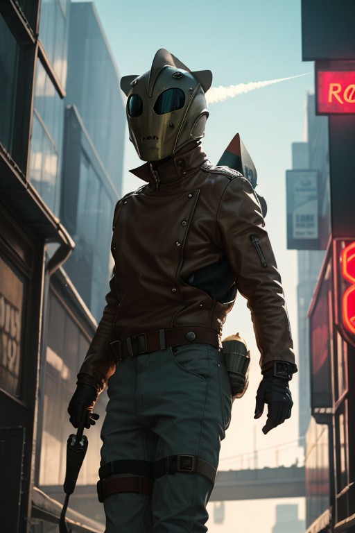 rocketeer, 1boy, helmet, jetpack, flying, flying toward camera, cyberpunk, science fiction, contrail, city , dynamic pose, fight stance, cyberpunk style, city, 8k, masterpiece, highly detailed, dynamic lighting, neon signs, high contrast, dark, gritty, <lora:rocketeer_v1.0:0.8>,