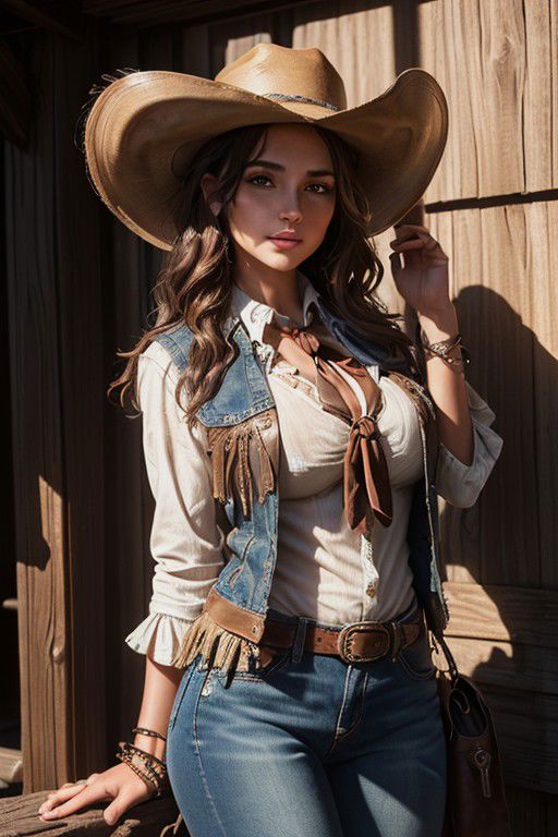(Vintage Western cowboy look: denim jacket, cowboy boots, fringed suede vest, bandana necktie, a wide-brimmed hat, and leather saddle bag), ((Caucasian girl)), Sweet expression, posing seductively, ((wavy hair, brown hair)), (8k, RAW photo, photorealistic:1.25) ,( lip gloss, eyelashes, glossy face, shiny skin, best quality, super high resolution , depth of field, chromatic aberration, caustics, wide light, natural shadows, looking at viewer with serenity and goddess-like bliss, full body, big breasts, Scenery in wild west, saloon,