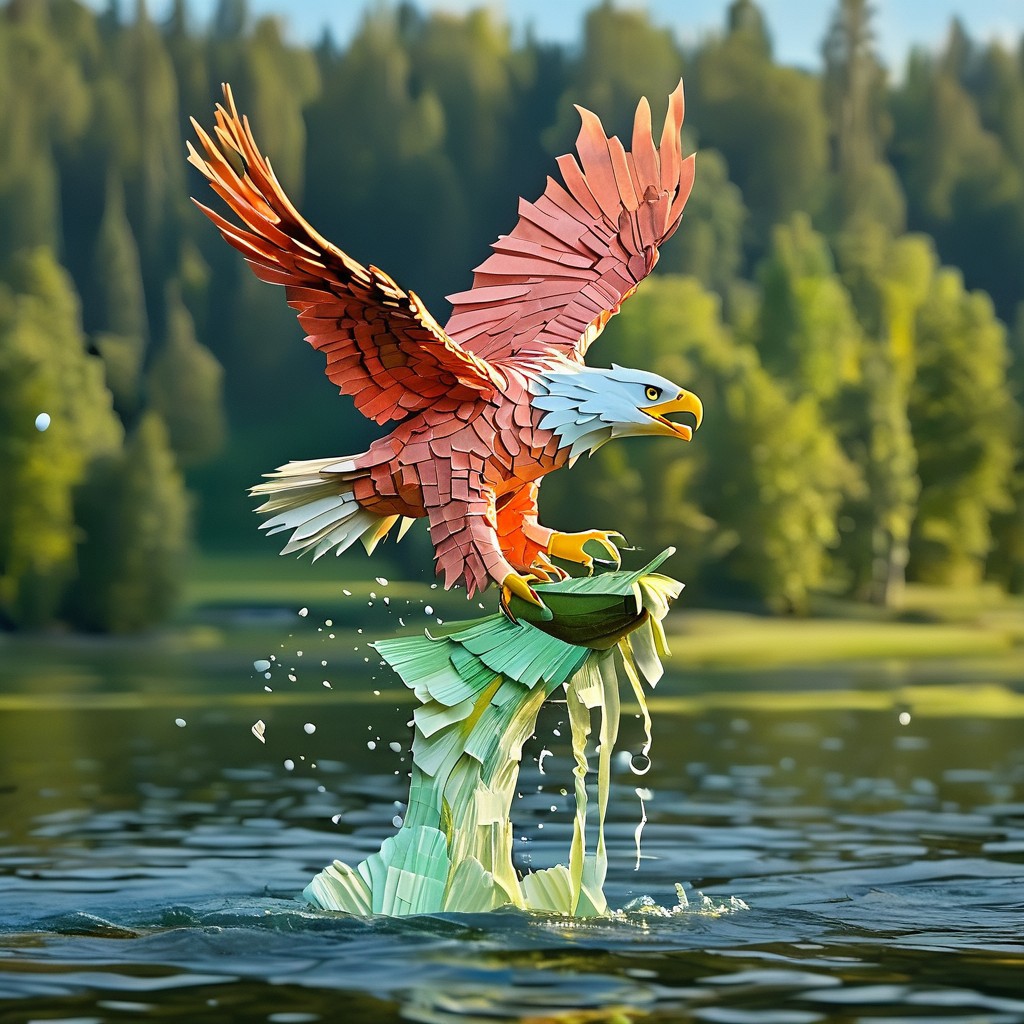 endposit_notesmorph, paper sticky notes, made from 3m post it notes, post it notes, paper texture Bald eagle catching fish in lake, focus on fish, salmon fish, perfect fish, vibrant colors, morning light