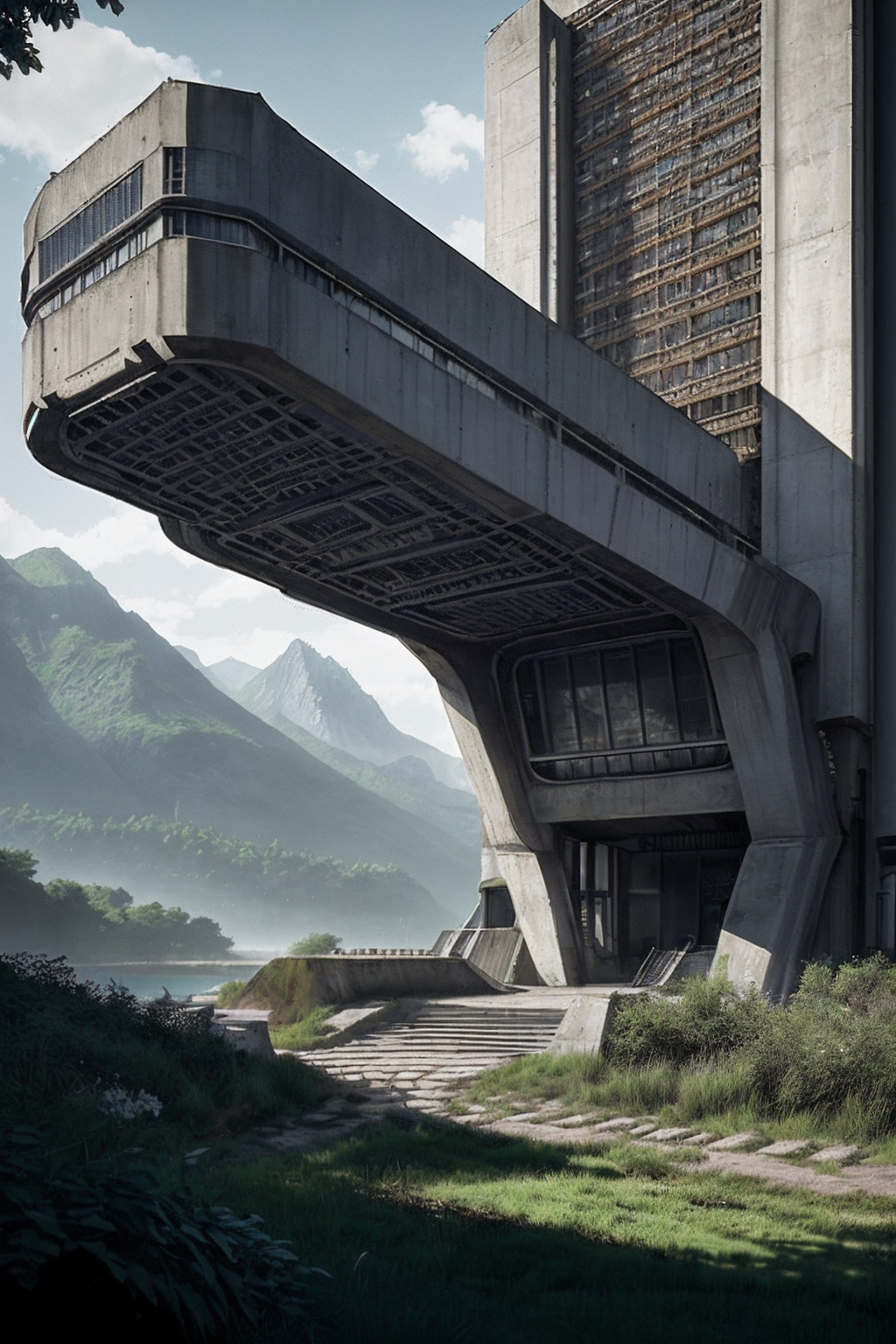 architecture,suviet architecture,photorealistic,retro,(soviet),(megastructure),low saturation,dirt,futuristic,concrete and shiny metal,details,texture,symmetric,dynamic light,film grain, lush greenery,majestic mountains,<lora:soviet architecture:0.7>,