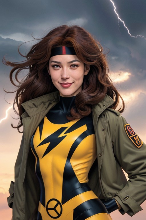 masterpiece, official art, dskheroes, 1girl, solo, long hair, smile, brown hair, brown eyes, medium breasts, jacket, upper body, looking to the side, bodysuit, headband, retro artstyle, hair behind ear, lightning, <lora:Heroes_Style:0.6>