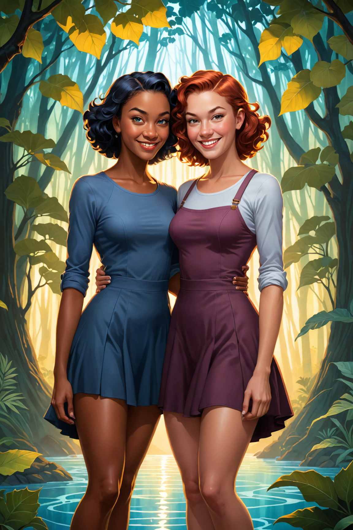 by (Jeannette Guichard Bunel and (Rob Gonsalves in the style of ((Aaron Douglas))) and Reylia Slaby), digital painting, dof, women, cute fit 18 year old lesbian couple <lora:more_art:0.30><lora:huge_anime_eyes:0.85><lora:attractive:0.75><lora:great_lighting:1.30><lora:aesthetic:1.15><lora:photorealistic_portrait:1.25><lora:clothing_slider:1.00><lora:RMSDXL_Enhance:0.45><lora:RMSDXL_Creative:0.35><lora:RMSDXL_Photo:0.45><lora:RMSDXL_Darkness_Cinema:0.50><lora:XDetail_heavy:0.45><lora:perfect_eyes:0.15><lora:perfect_hands:0.15><lora:midjourney:-0.15><lora:looking_at_viewer:0.75><lora:dpo:0.25>