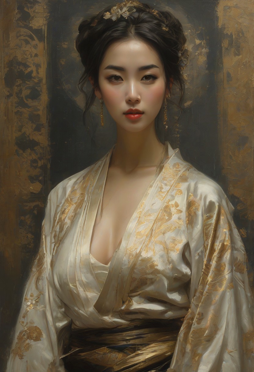 seductive beautiful Japanese empress, full body portrait, open kimono, breasts exposed, busty, top hard light, Dark environment, black over black, highly detailed, large breasts, sideboob, cleavage, masterful painting in the style of Anders Zorn , Yuri Ivanovich, Jeff Simpson, oil on canvas