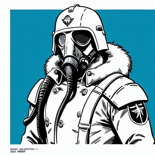(Digital Illustration), Death Korps of Krieg Soldier, helmet, Model 4 gasmask with tube, cold weather gear, white uniform, fur lined, bloody, portrait, dynamic composition, bold lines, blue splashes, winter war, (((line art))), comic art, linear, limited color palette, minimalist line art, pop art, comic book style, solid colors,