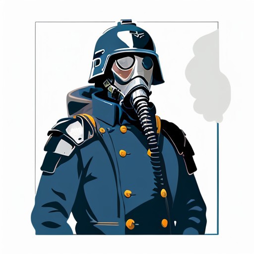 (Digital Illustration), Death Korps of Krieg Soldier, dkok, helmet, Model 4 gasmask with tube, (oxygen pack), cold weather gear, white uniform, fur lined, bloody, portrait, dynamic composition, bold lines, blue splashes, winter war, (((line art))), linear, limited color palette, ((minimalist line art, pop art, solid colors, minimalist)), (((flat colors)), (((minimalist shading, unshaded)))), small lenses, circular lenses