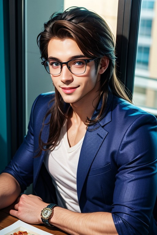 1boy, beautiful male femboy, androgynous, pretty face, very long hair, very dark brunette, blue eyes, face, light tanned skin, suit jacket, black T-shirt, glasses, clean shaven, athletic, open jacket, polite smile, glimpse through the window, bokeh,