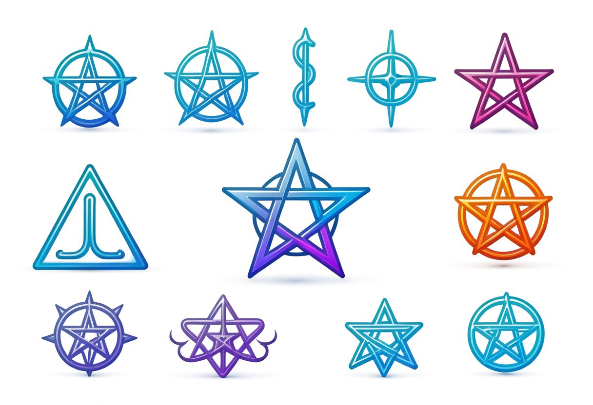 vector illustration in 3D realistic syle, shadows, photorealistic, highly detailed, ((no perspective)), 2d, occultic sigils, pentagrams, thin outline, detailed shading, colorful, items set, medium set, simple white background,