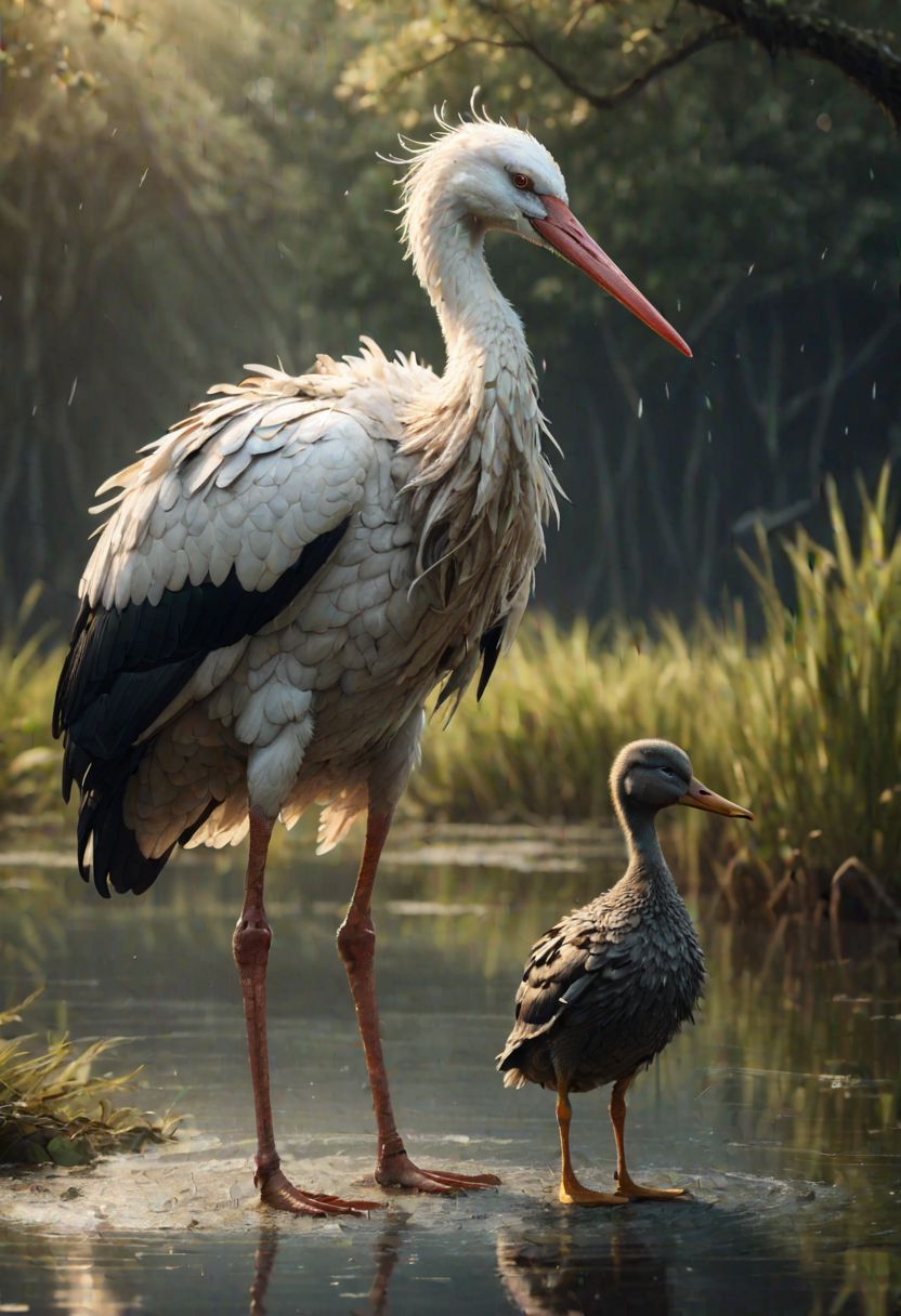 stork in hairy armor with a duck's beak, stork stands up to its knees in swamp, photorealistic, intricate, high detailed, cinematic lighting, octane render, abstract, ((uniform light background, matte background:1.4)),