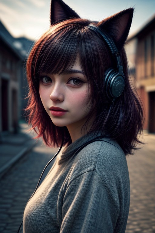 (masterpiece, best quality, highres:1.2), raw portrait photo of cute Girl with headphones, cat ear headphones, colored hair, in high detailed textured, (most iconic photo), (village background), depth of field, morbid, dynamic time, (light smile:0.3), SFW,