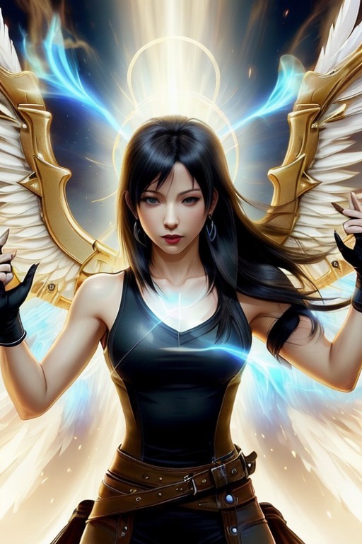 tifa lockhart, final fantasy 7, high fantasy, high detailed, elegant, majestic, detailed, pretty, beauty, perfect, sleek, world morph, perfect morph, fantasy, magical energy, excessive energy, divine aura, worldoflight, heavenly, angelic