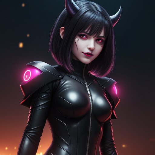 succubus, futuristic, scifi, small breasts, solo, medium hair, hair over face, big gloves, dutch angle, smirk, technology, glowing eyes, neon, dark lips,horns, fangs