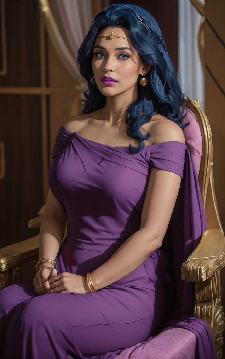 (masterpiece, best quality:1.4), insaneres, absurdres, solo, looking at viewer,BREAK CARTOON_CaptainPlanet_Gaia_ownwaifu, 1girl, circlet, long hair, black hair, dark skin, earrings, blue eyes, lipstick, makeup, blue hair, large breasts, multicolored hair, colored skin, lips, big hair, collarbone, purple lips, wavy hair, dress, purple dress, bare shoulders, cape, jewelry, bracelet, (sitting on throne, sitting, throne), throne room, straight-on, curtains, light particles, bokeh, loaded interior, indoors, <lora:CARTOON_CaptainPlanet_Gaia_ownwaifu:0.75>, solo,