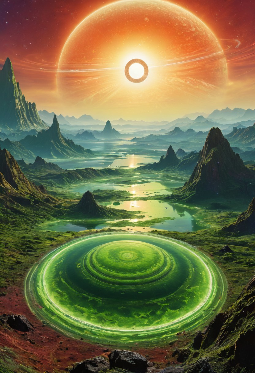 masterpiece, An oil painting of a verdant alien planet, planet with rings in the sky background, vibrant colors, best quality, highly detailed, 8k