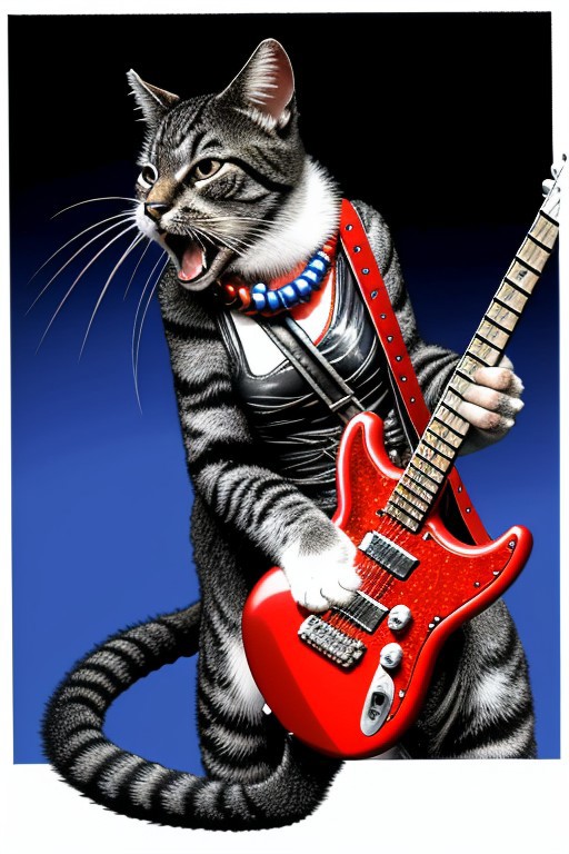 Hyper-realistic digital illustration featuring a 1980s hair metal cat playing RED ELECTRIC GUITAR, concert, stage, arena, photography, very realistic