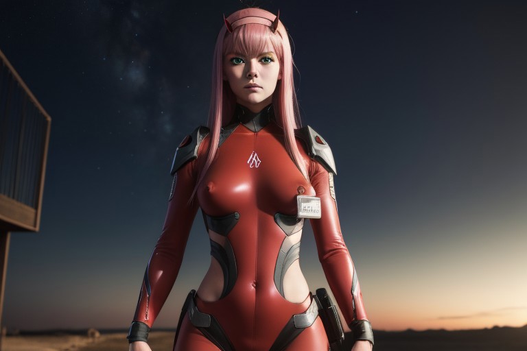 zerotwo, <lora:zerotwo-lora-nochekaiser:1>, zero two, (green eyes:1.5), hairband, horns, long hair, pink hair, red horns, white hairband, BREAK bodysuit, covered navel, pilot suit, red bodysuit, science fiction, BREAK outdoors, space, night, sky, star \(sky\), BREAK looking at viewer, (cowboy shot:1.5), BREAK <lyco:GoodHands-beta2:1>, (masterpiece:1.2), best quality, high resolution, unity 8k wallpaper, (illustration:0.8), (beautiful detailed eyes:1.6), extremely detailed face, perfect lighting, extremely detailed CG, (perfect hands, perfect anatomy),camel toe,full body shot,niptag, nipples
