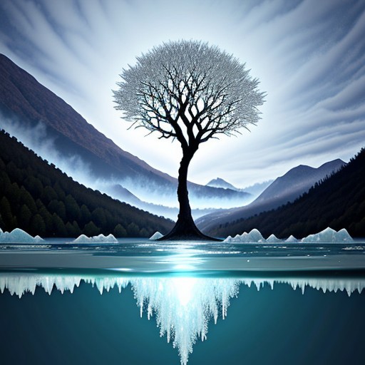 great giant icy magical tree arising from being submerged lake on fire mountain