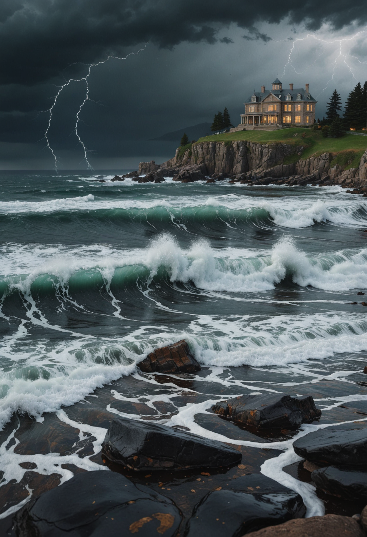 cinematic photo A painting of a rocky beach with grand waves crashing on it and a thunder in the background with a mansion on the hill, rainfall, extremely detailed oil painting, volumetric light, 16k, artstation., <lora:SDXL_black_and_color_Sa_May:0.9>, black_and_color . 35mm photograph, film, bokeh, professional, 4k, highly detailed