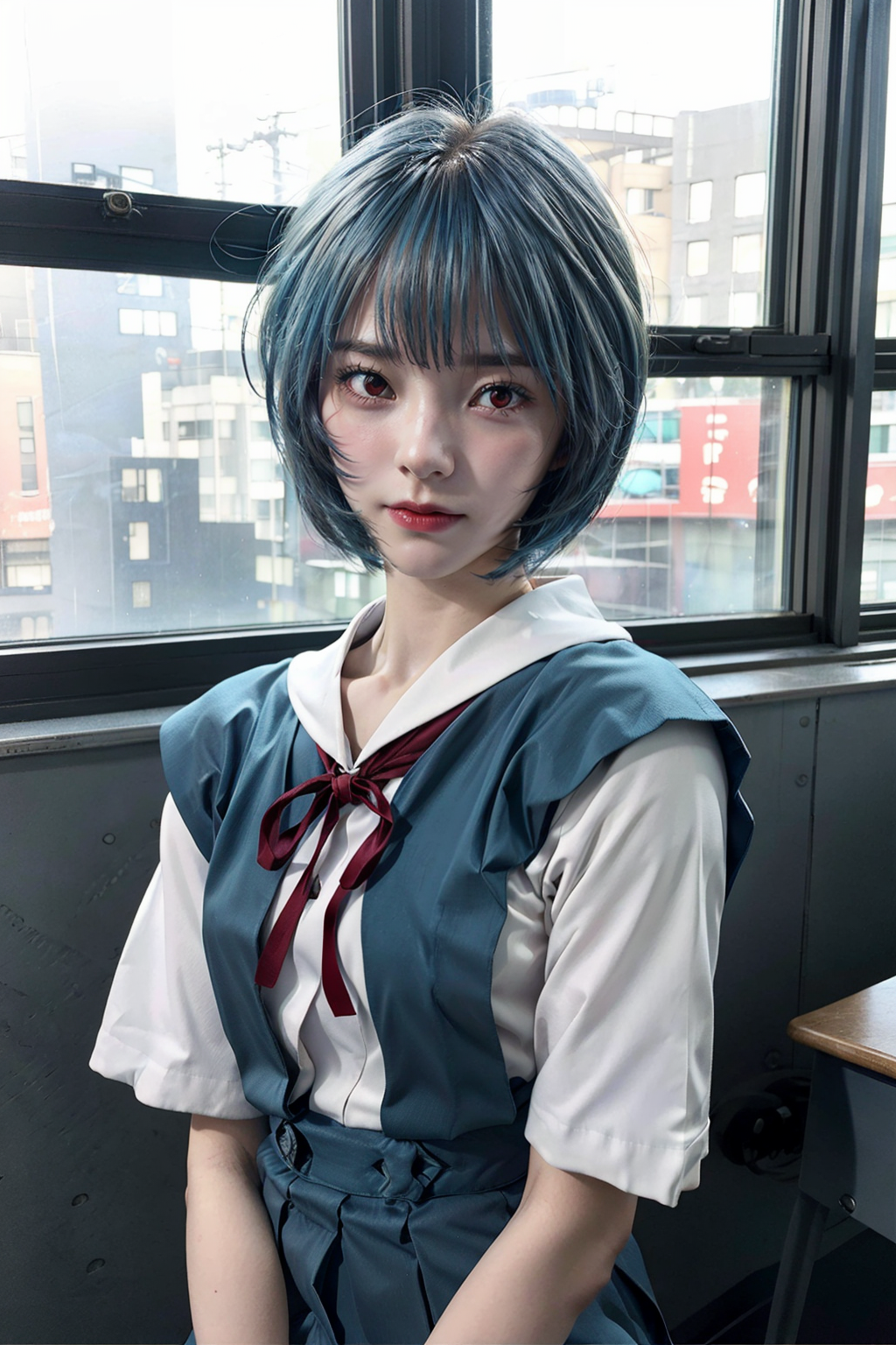 1girl,ayanami rei,masterpiece,(blue hair, red eyes, bob cut, skinny, aged down),(film grain, bokeh),a beautiful girl wearing a school uniform,pale skin,cold white skin,no expression,cold expression,indifferent expression,seating in a classroom in tokyo,solo,classroom interior,beside the window,<lora:AyanamiReiV6:0.8>,<lora:eva school uniform:0.8>,<lora:Detail Tweaker:0.6>,<lora:great_lighting:0.8>,RAW photo,best quality,(realistic,photo-realistic:1.3),masterpiece,extremely detailed,<lora:JapaneseDollLikeness_v15:1>,a dim sunset behind,dusk,