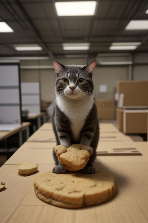 cat made of creamy cookies, set in a site office, with temporary structures, planning boards, construction schedules, and supervisors in safety vests, ,Masterpiece,best quality, photo, realistic, very aesthetic,